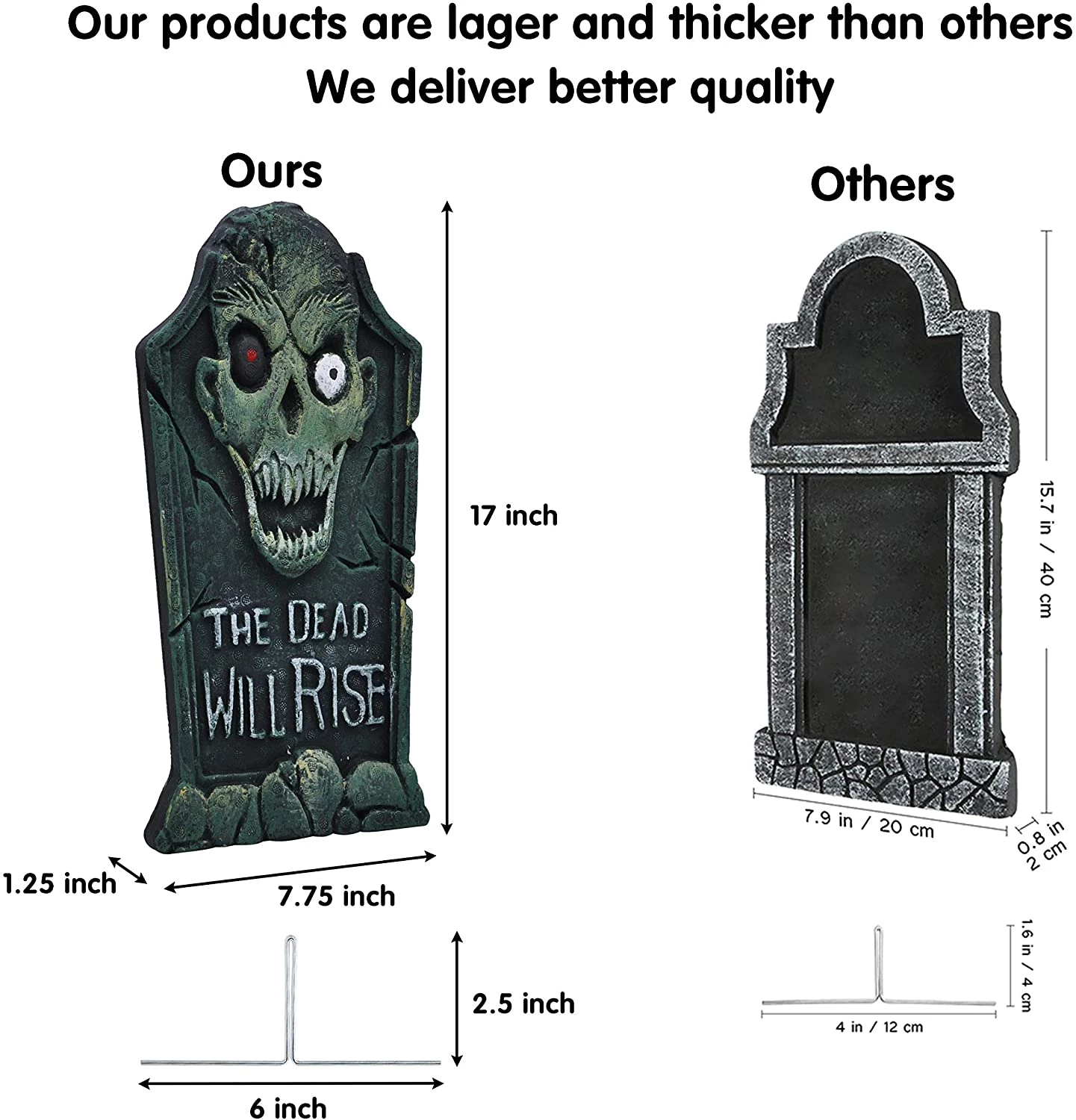 - These 6 tombstones are more sturdy, thicker, and bigger than any other brands. Metal stakes can secure them better than any other plastic stakes