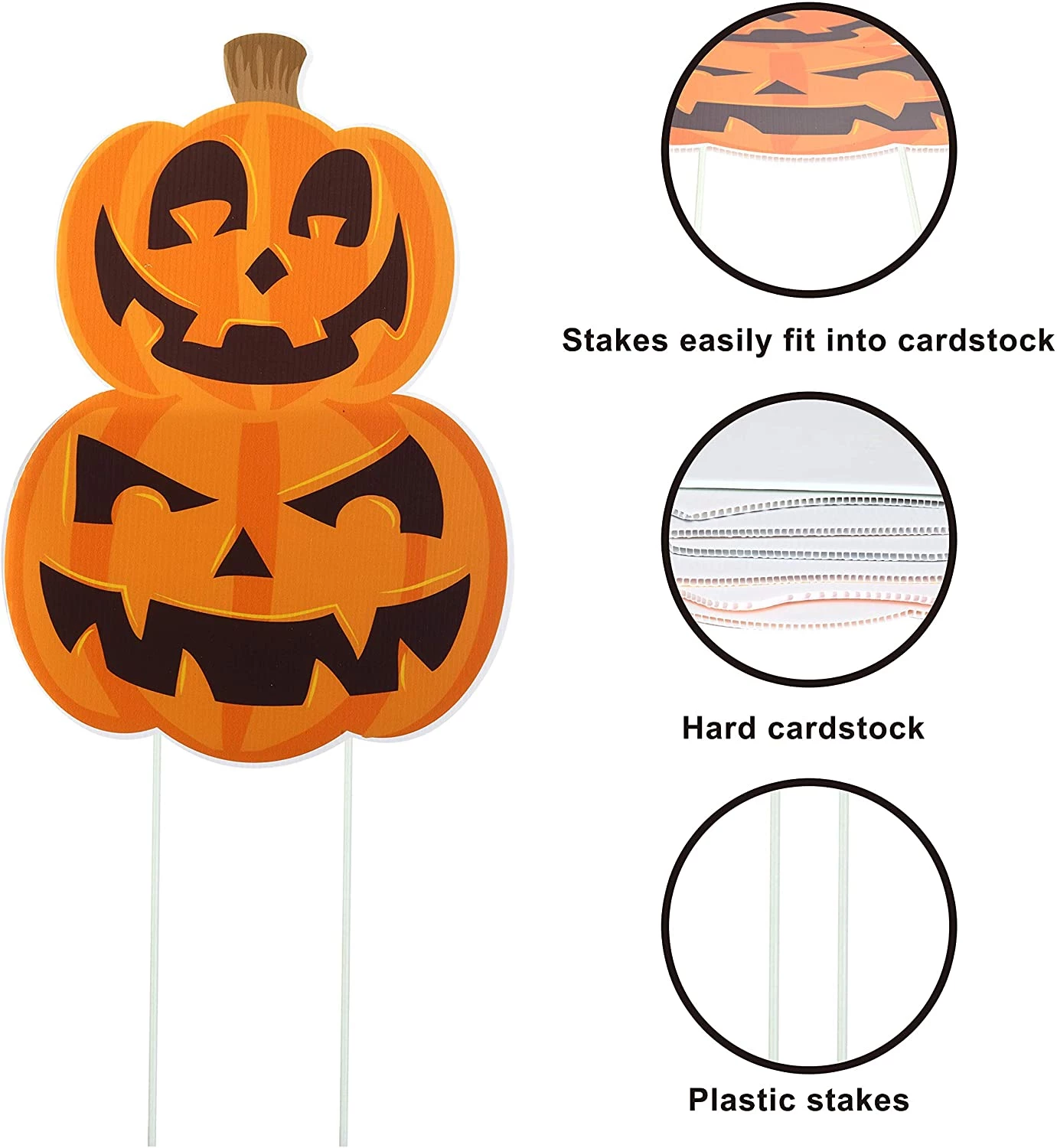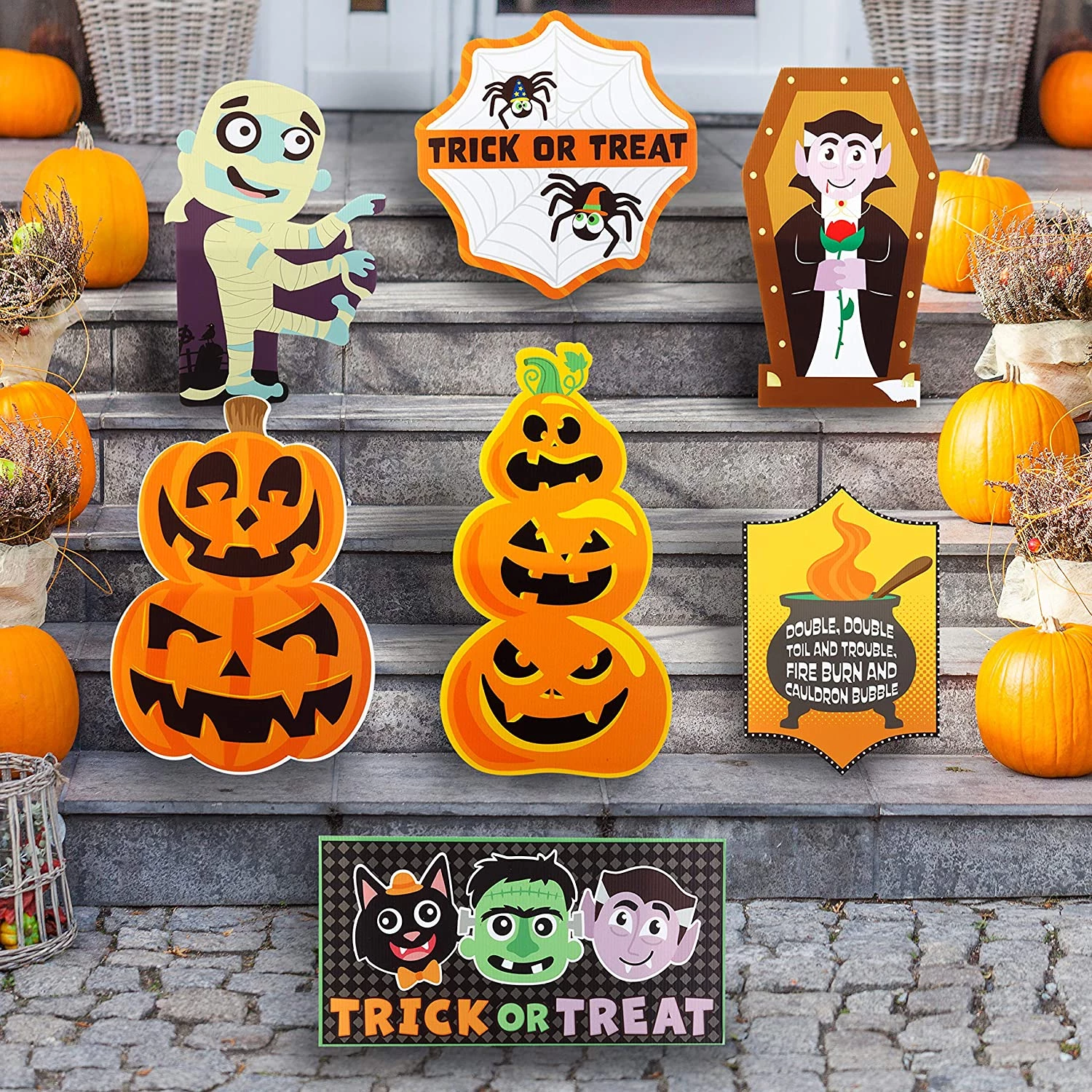 - SUPER VALUE PACK. Our yard stake signs come in 7 pieces with different designs: 2 pumpkins, 1 vampire, 1 mummy, 1 cauldron, 1 spider, and 1 trick or treat sign
