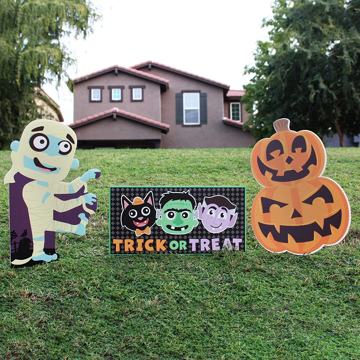 - UNIQUE AND FESTIVE. Welcome trick-or-treaters and Halloween party guests with these spooky Halloween yard signs! Make yours the house trick-or-treaters won’t ever want to miss by adding outdoor Halloween decorations to your bag of tricks