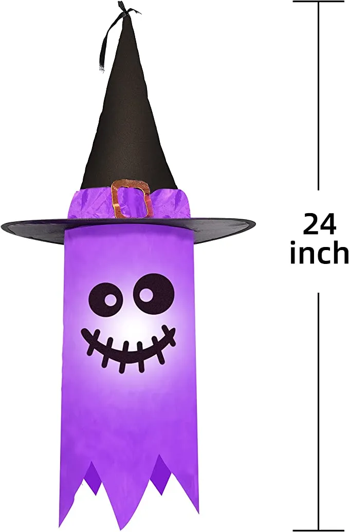 - Our light-up hanging ghost set comes in 8pcs with remote control. Each of the ghosts measures 24″ and has 36ft long 100 led light strings.