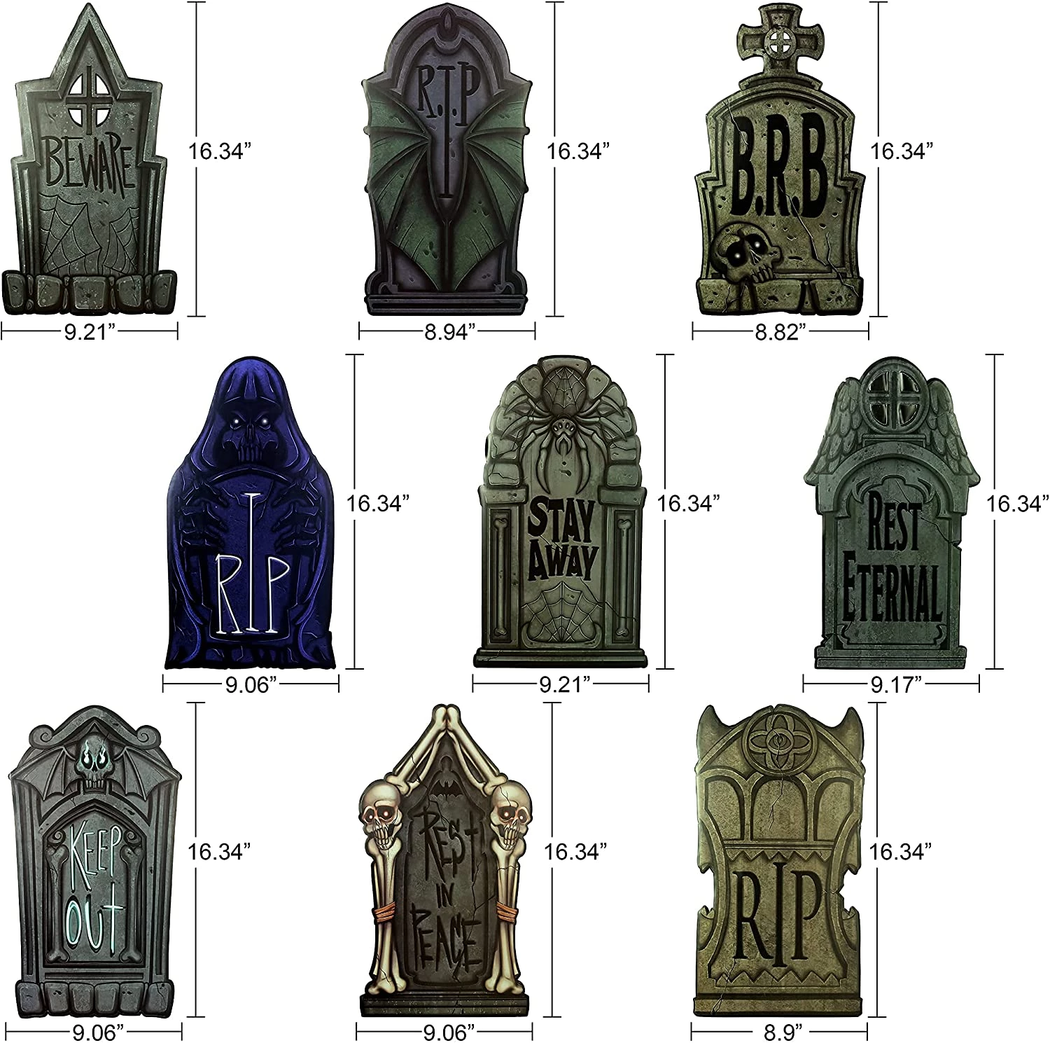 • Tombstones for Halloween include a 9-pack Halloween Tombstone Yard Sign. These are made from PVC material and come with high-quality material
