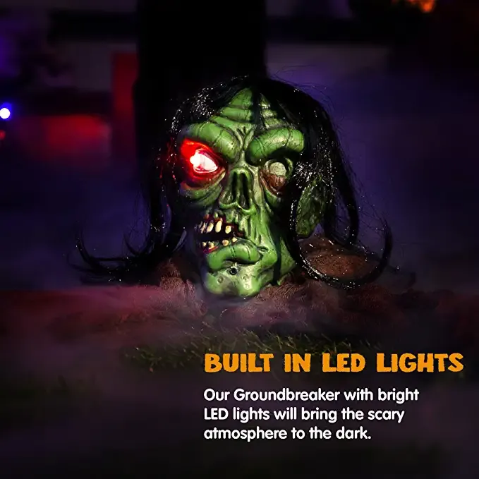 - REAL FUNCTION. Our green head zombie groundbreaker is motion activated with light-up eyes and creepy sounds. This motion activated halloween decorations is made of high quality latex, plastic and fabric. 3 AAA Batteries Required. Batteries Not Included.