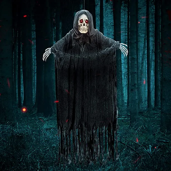 • Grim Reaper Halloween Decoration comes with 60″ Grim Reapers look scary featured with Red Colored Light up eyes and has a creepy sound.