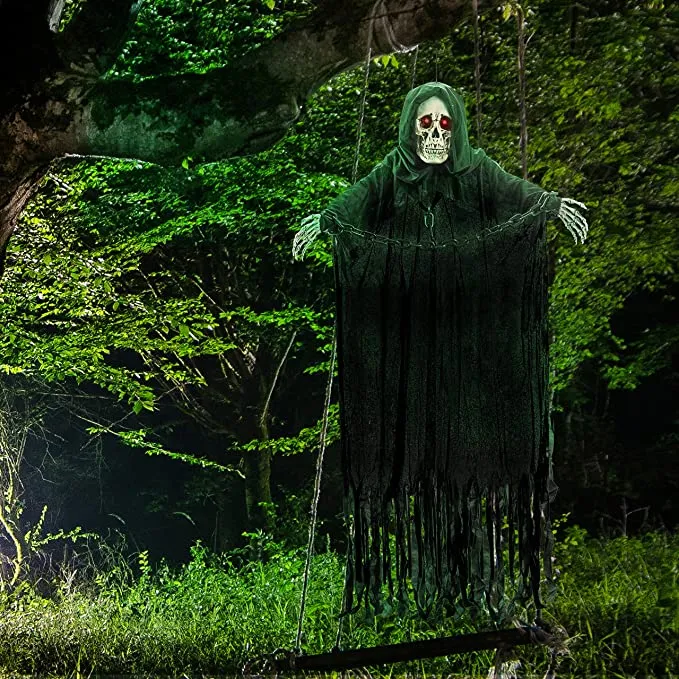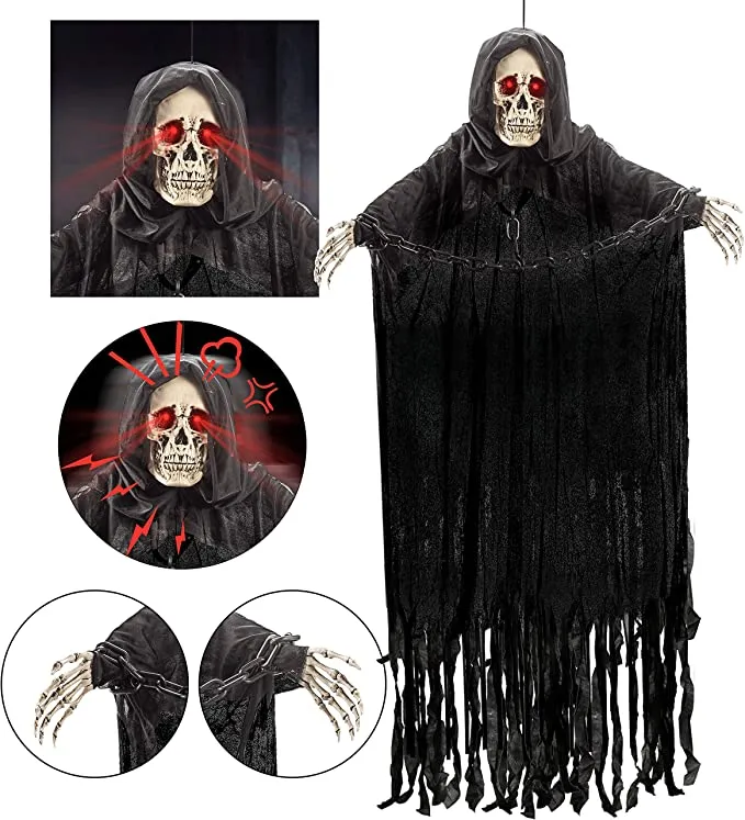 The grim reaper decoration will make your guests think twice before they walk into your haunted house during Halloween as he moves his head back and forth while spinning his scythe around in front of him. This spooky decoration is also perfect for any party where everyone wants to have some fun with their friends by scaring them! It has an adjustable chain so that you can hang it anywhere from the ceiling or even from the top of your door frame. The glow-in-the-dark eyes will make sure that this hanging decoration never goes unnoticed even when its lights are turned off!