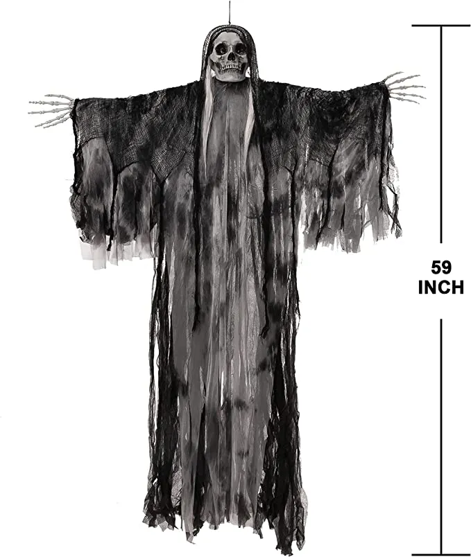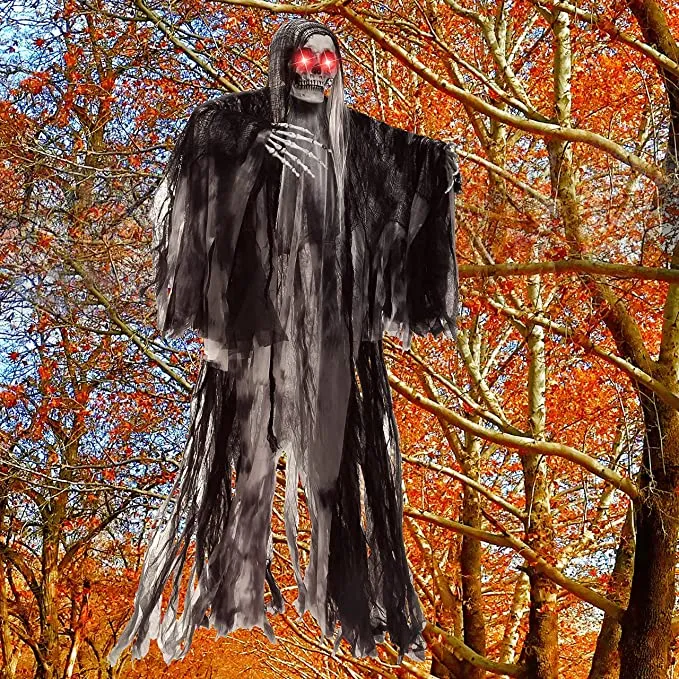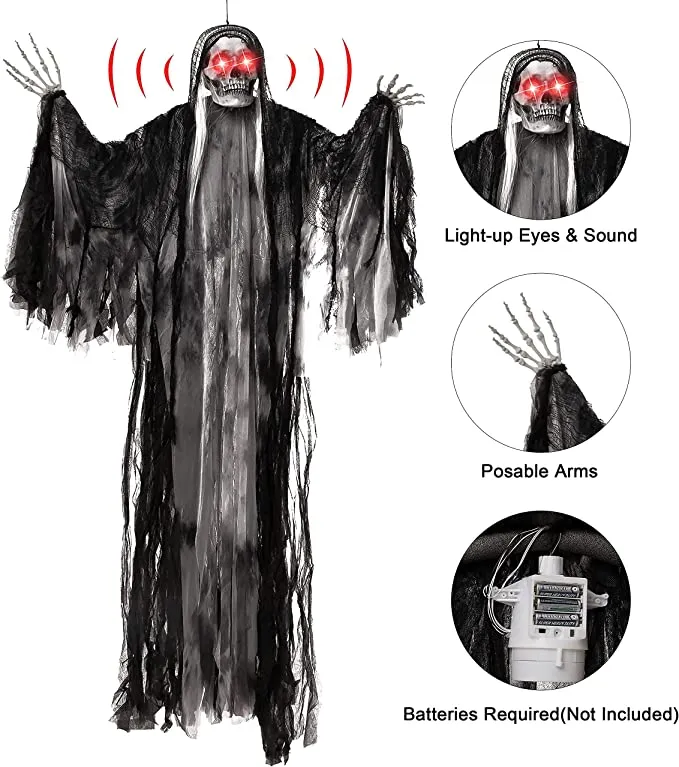 • Grim Reaper Outdoor Decoration comes with 1 pack grim reaper outdoor decoration designed with glowing eyes, sound effects, shaking function, and voice control. The size of this Grim Reaper is 59 inches. It is easy to be noticed, perfect for your spooky Halloween theme!