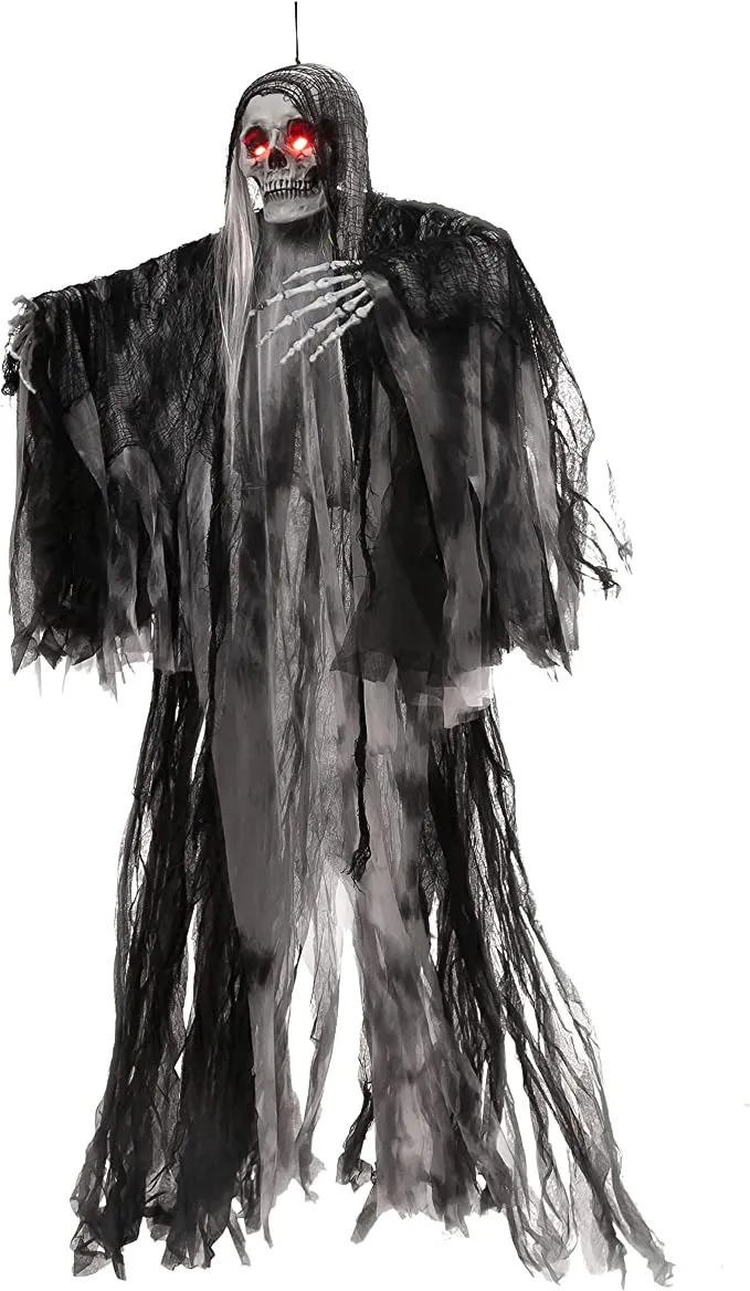 This hanging animated grim reaper Halloween decoration will only dare to cross paths with the brave. The reaper is on the lookout for his next prey, a deathly cloak encircling his skeletal hands and skull. This nearly 5-foot-long figure hangs nicely from a high beam, hook, or tree branch! His eyes light up, he has sound effects, a shaking feature, and voice control. He is covered in a gauzy black and white hood and shredded material. When your guests come into contact with this spooky décor accessory in your parlor, restroom, or coat closet, they will all experience the same chilling sensation down their backs. The ominous crimson glow of his haunting eyes and the demonic laugh of his terrible grin will frighten anyone who dares to look him in the face.
