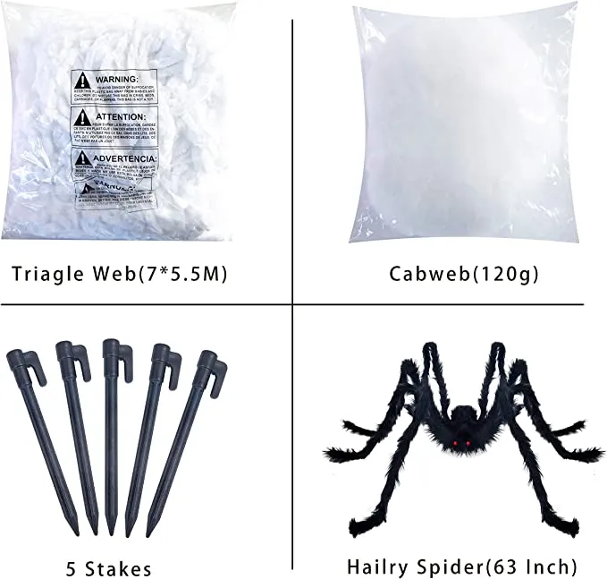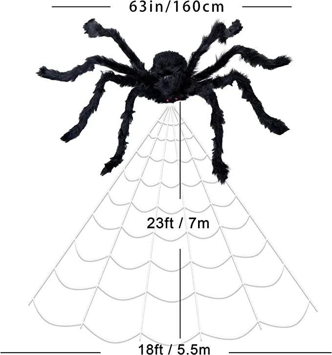 - Our giant triangular spider web measures approximately 23 “18 ft (7″5m). The large spiders measure about 5.25 ft (1.6m). The 120g super stretchable cobweb can be stretched up to 330 sqft