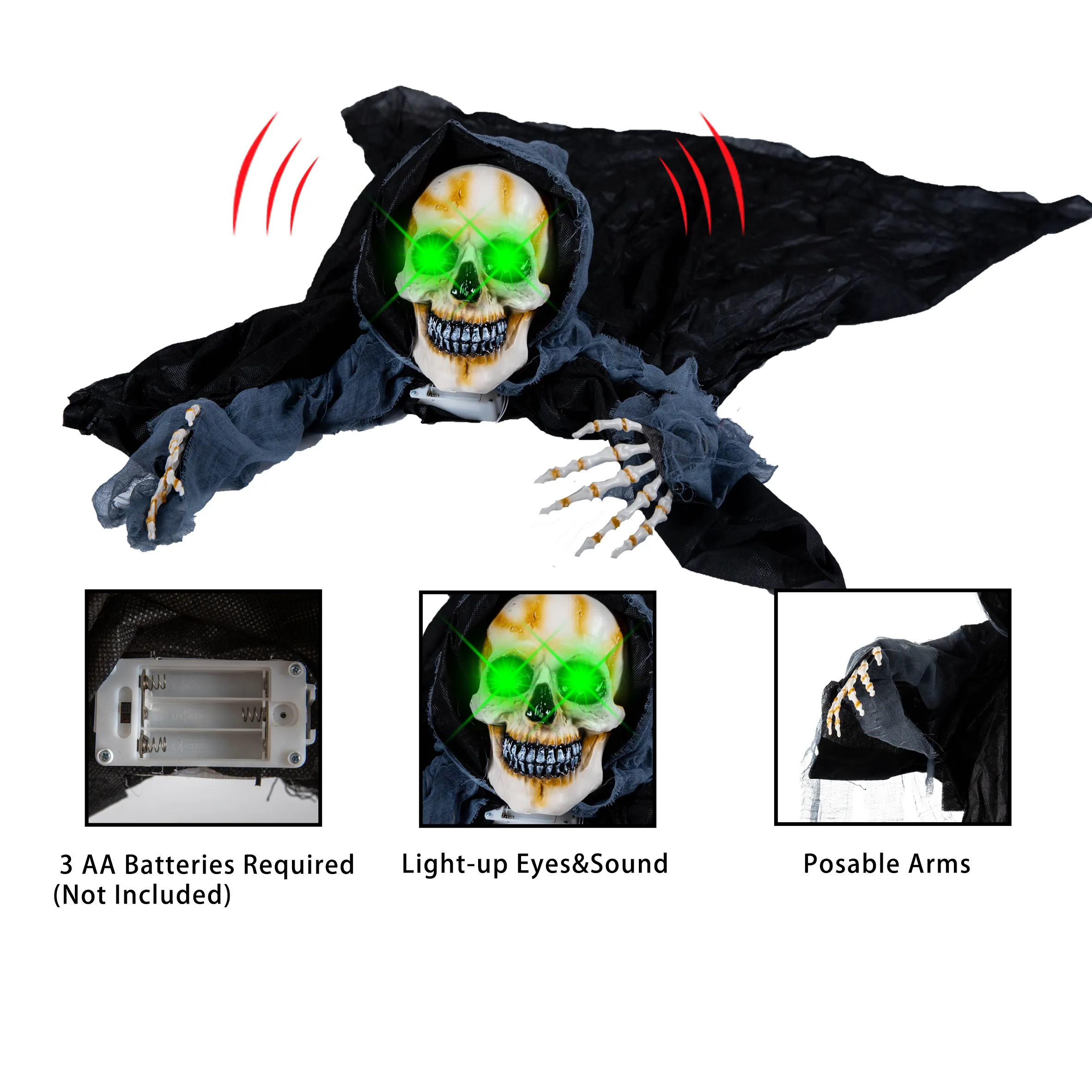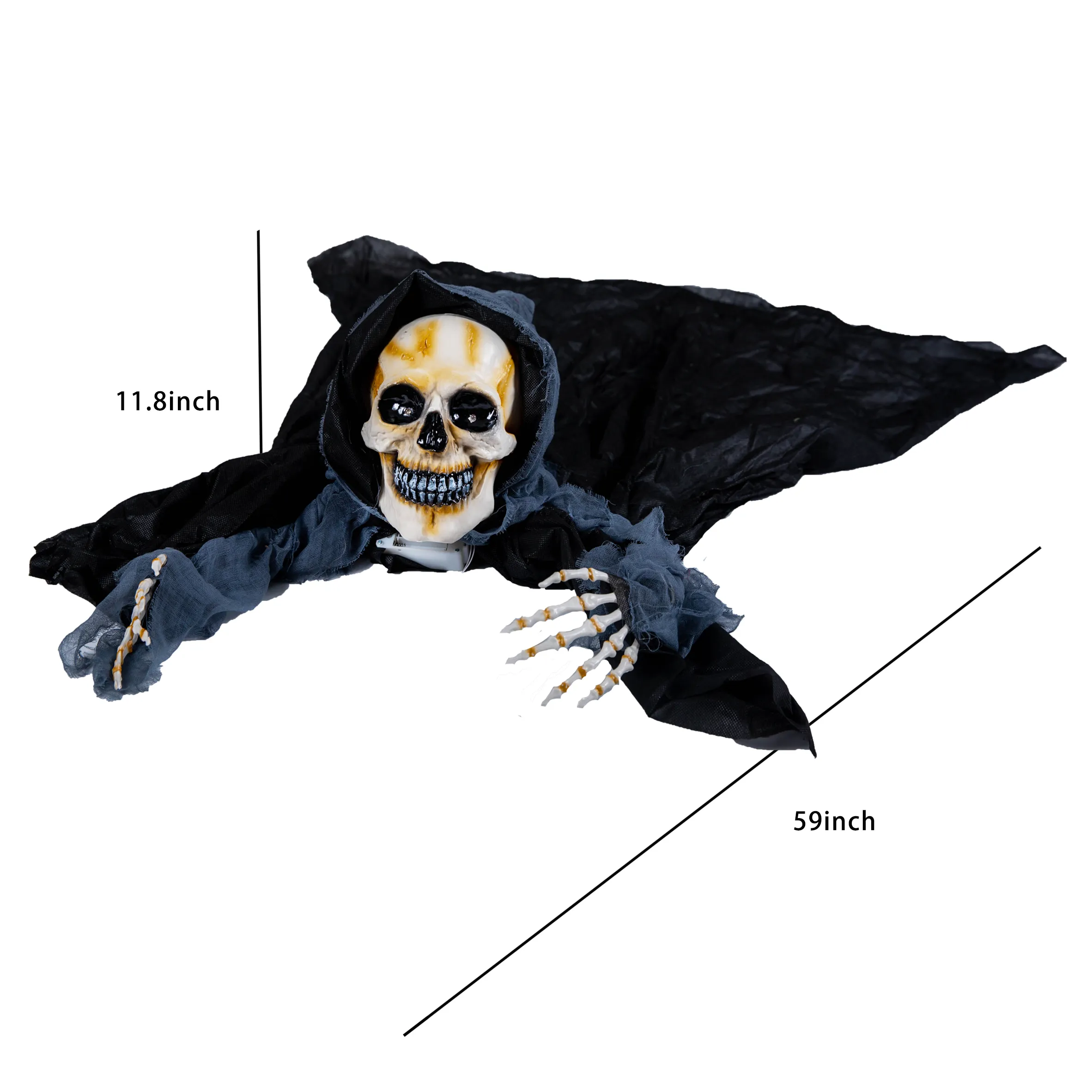 - Our grim reaper groundbreaker is equipped with a motion sensor that will activate its creepy sound and will flash scary lights in its eyes. It measures 59 inches.