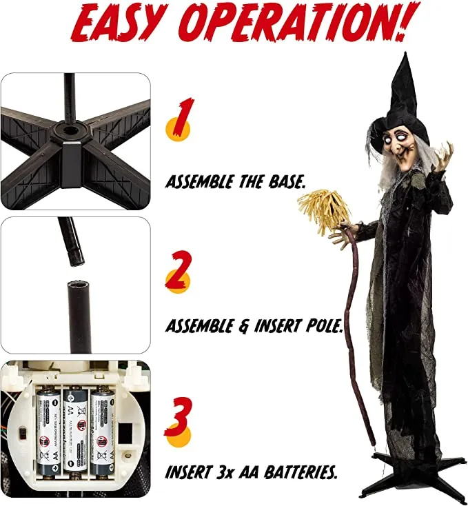 - The witch decorations need AA Batteries to work (BATTERIES NOT INCLUDED). Creepy sounds and LED flashing lights will activate once turned on.