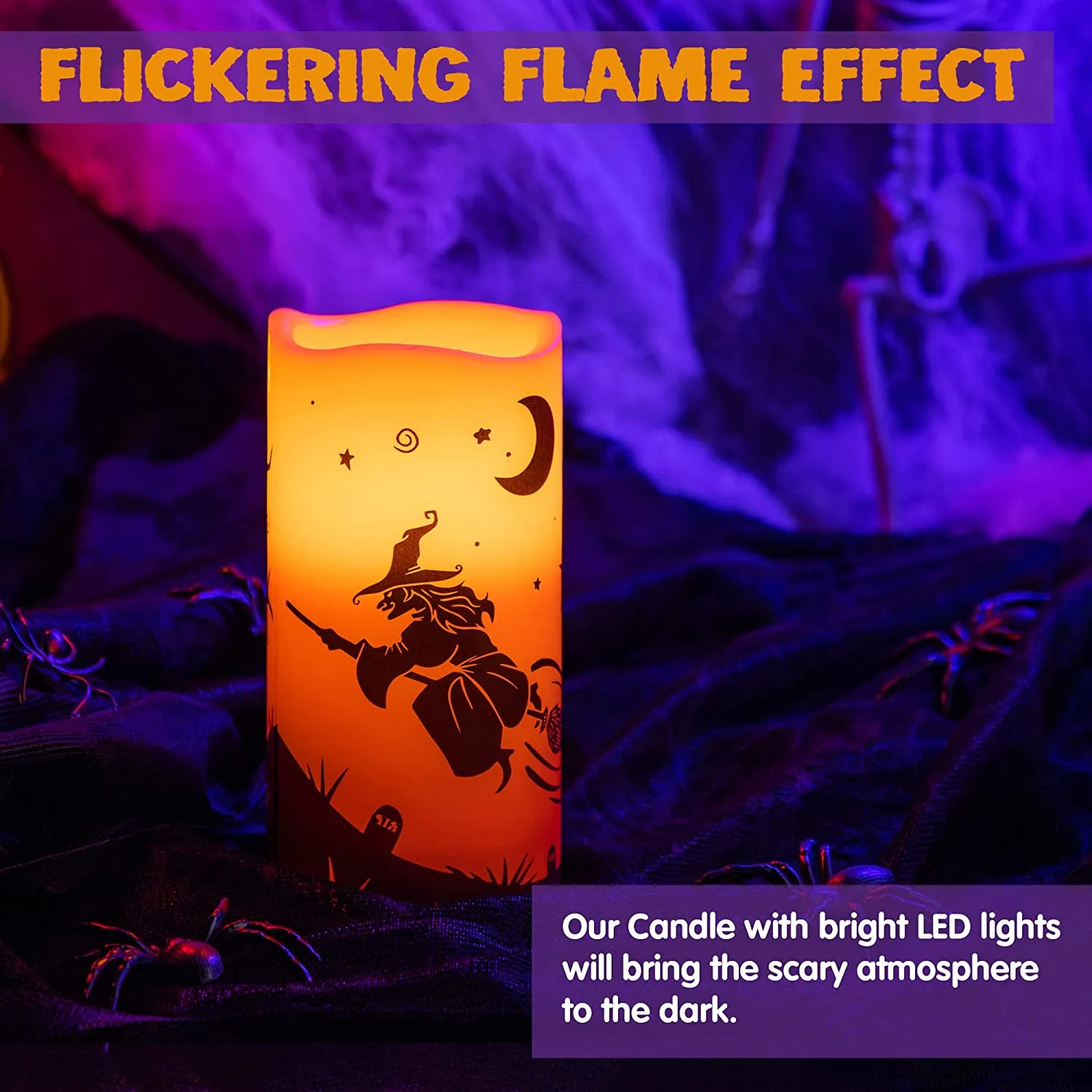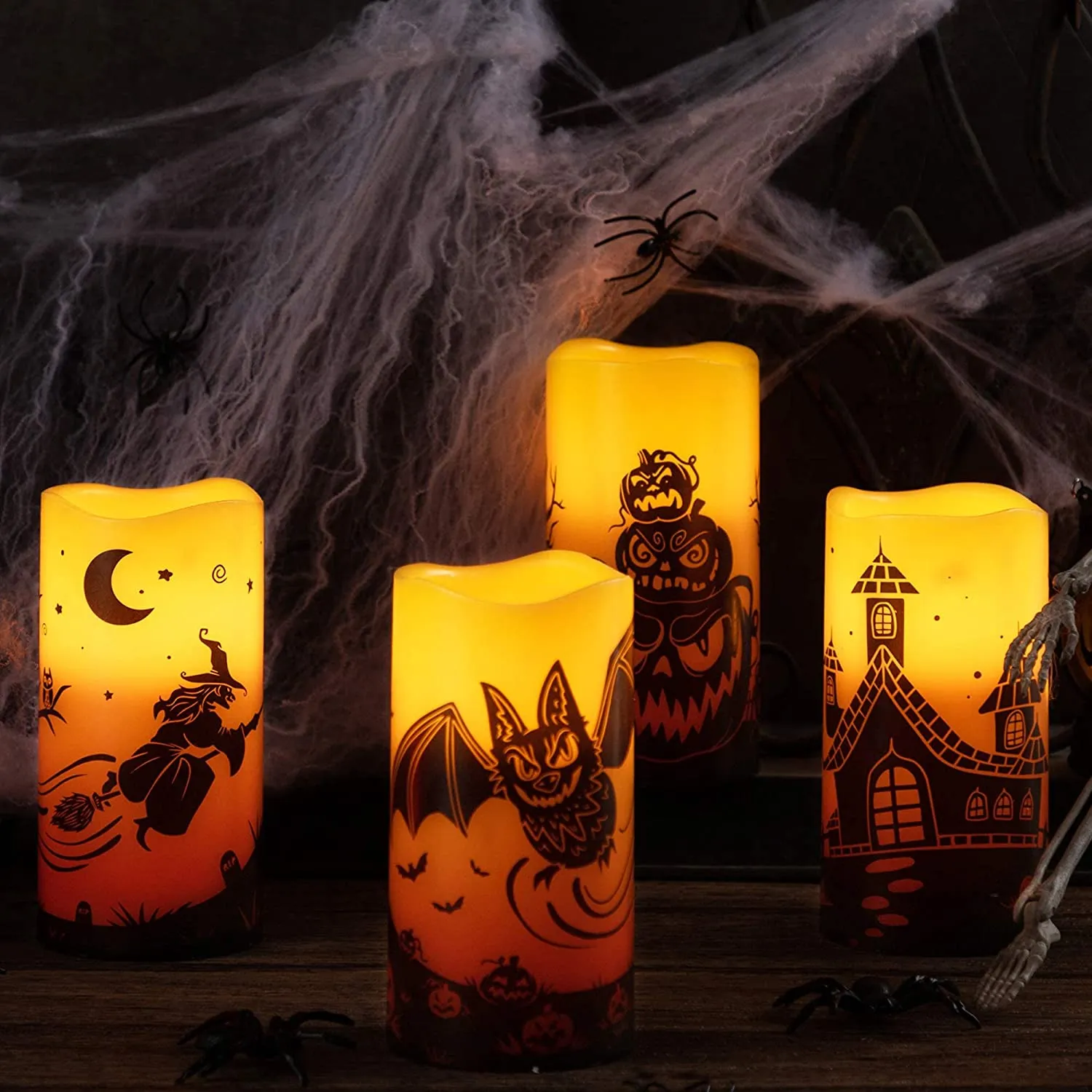 - AWESOME HALLOWEEN DECOR. Our Halloween Battery Operated Decoration includes 4 pcs of Halloween-themed flameless candles, made of four different black pumpkin designs. These Indoor Spooky Candles also have a 6-hour light-up time.