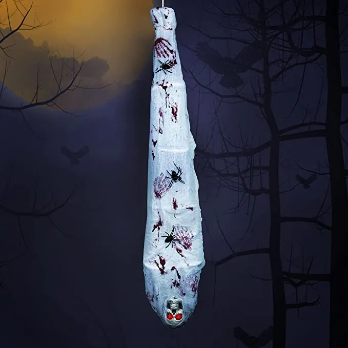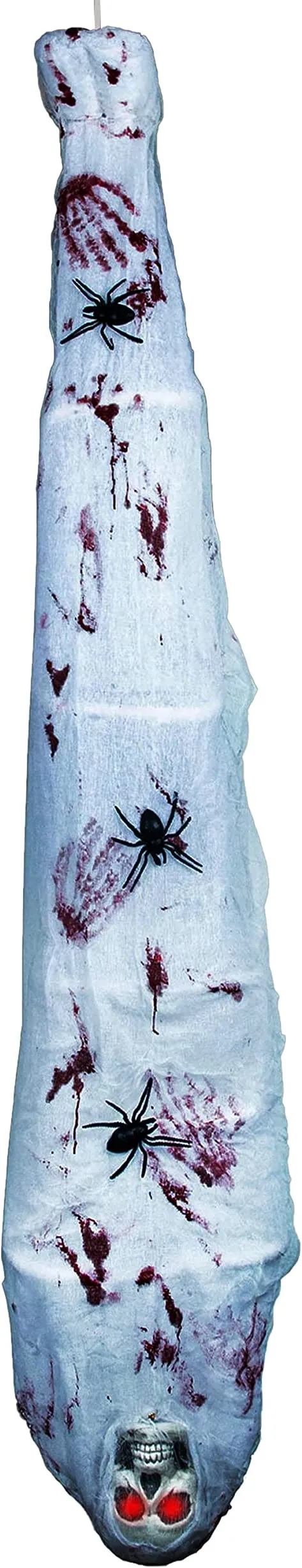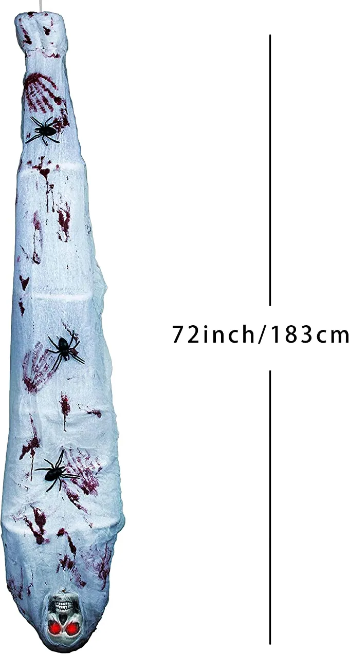 - Large Size – This hanging skeleton mummy cocoon corpse decoration measures 72 inches. It is a great size for spooky Halloween and/or haunted house decorations.