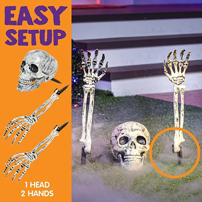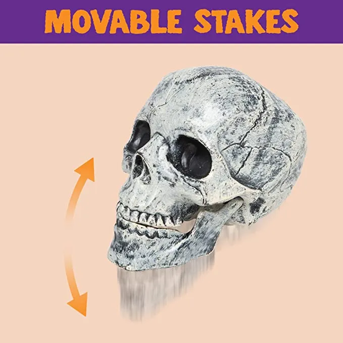 • Easy Setup, Push Arms Stakes into the Ground, and Put Skull between them. This is an Amazing Addition to your Graveyard Scenes, and will definitely Trick your Guests.
