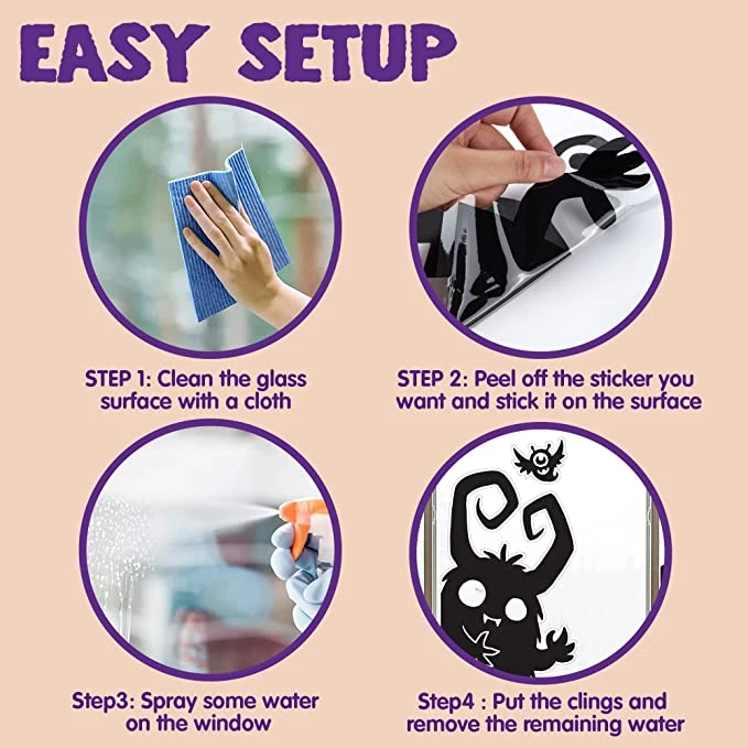 - EASY SET-UP. This window clings Halloween decorations are used with no glue, easy to peel off and reusable.Once this Halloween clings for windows is in place, use a firm card to force out any trapped air by sliding from the center to the edges.