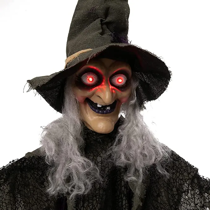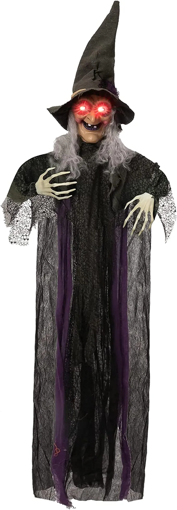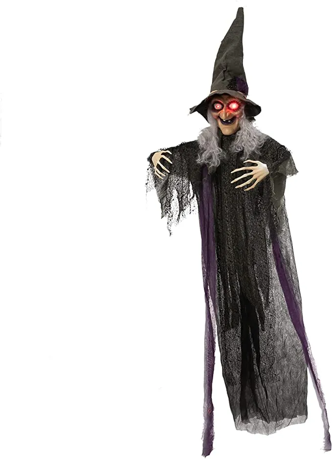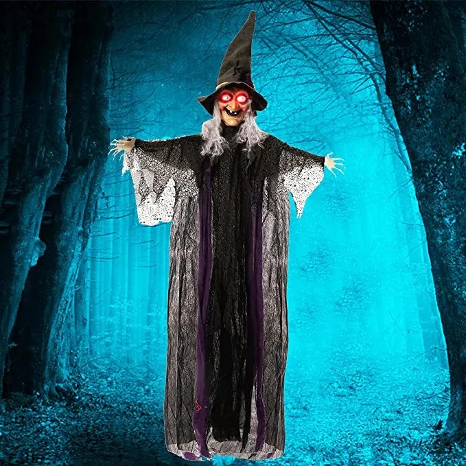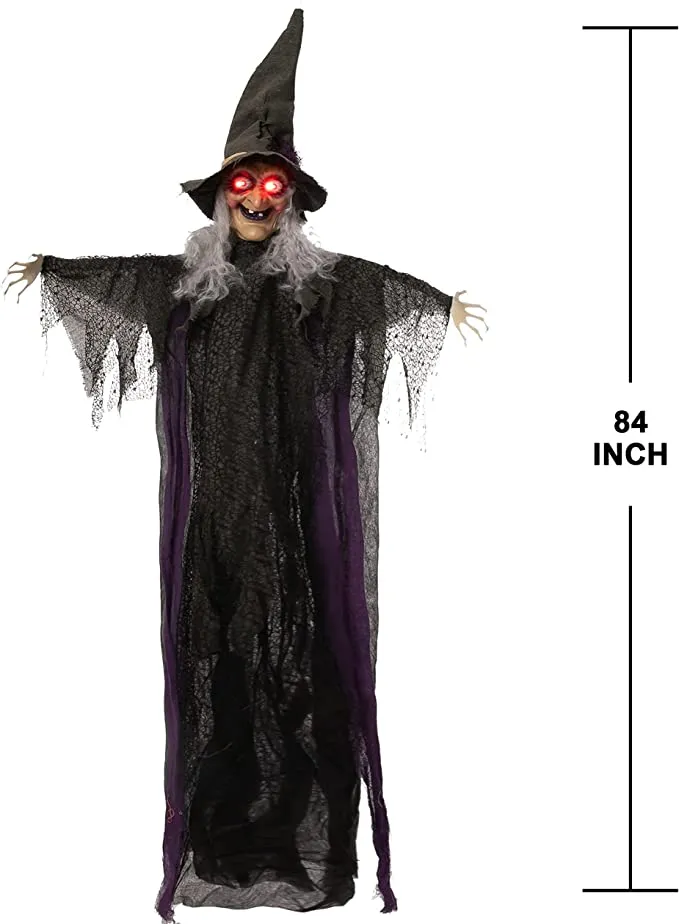 - Our Halloween Decoration includes 1 pack Hanging Witch with Round Eyes. This Grim Reaper is 84 inches in height. It has sound effects and it is voice controlled.