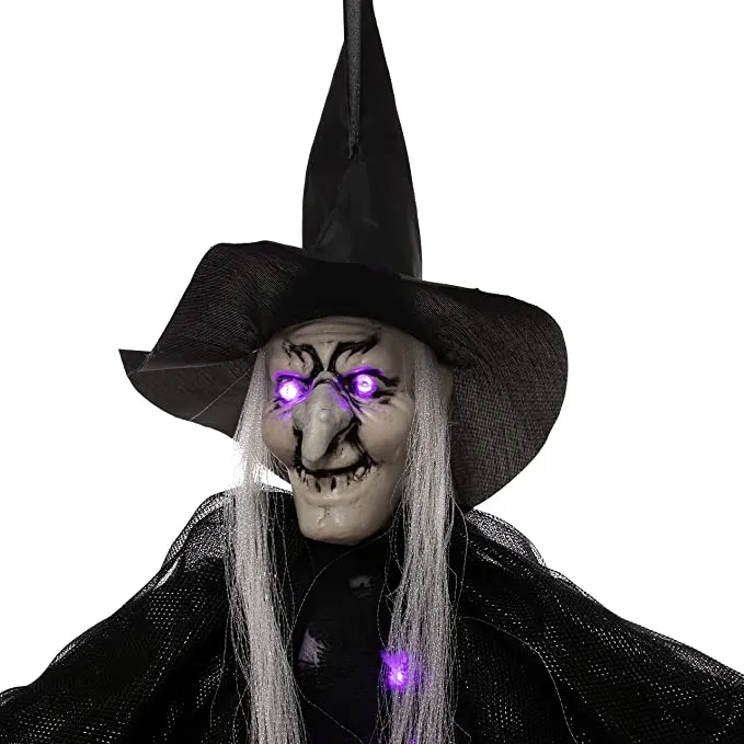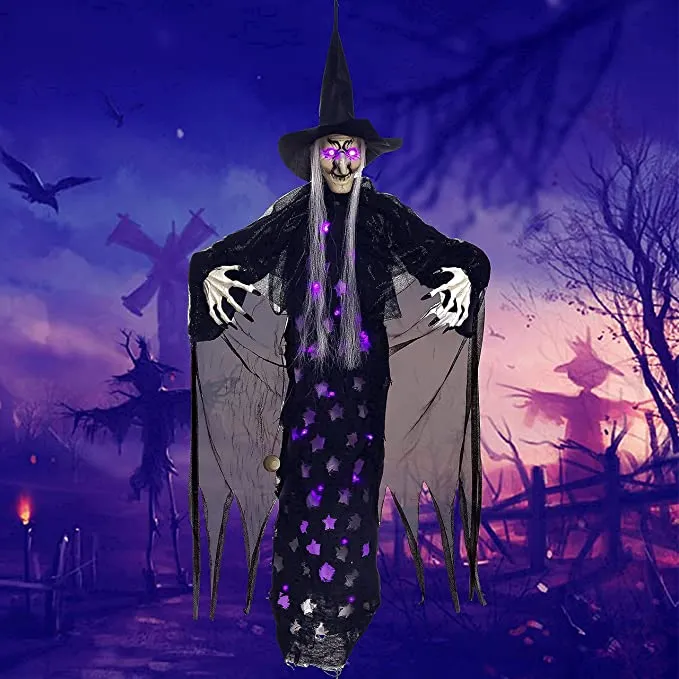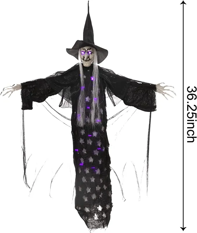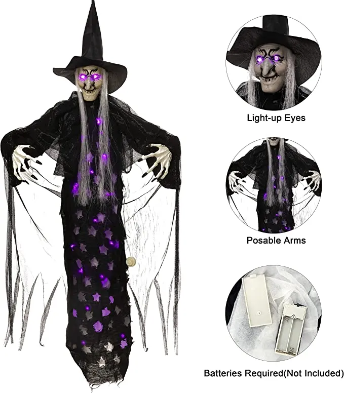 - Our outdoor Halloween decorations include 1 pack of full-body luminous hanging witches with transparent gauze shawls. This outdoor decoration hanging witch uses purple light design, you need 2 AA batteries (not included) to make the product light up, adjustable arms swing different shapes, very suitable for Halloween hanging decoration. Its height is 36.26 inches in line with the Halloween hanging decorations.