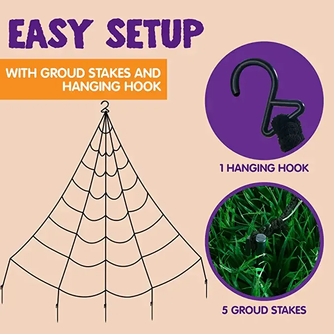 - EASY TO INSTALL. Our spider net Halloween decoration is easy to fix in minutes with the hanging hook on the top and the threads at the end of the web. And with the compact design, you can easily store the Halloween Spider Web for reuse without occupying much space.