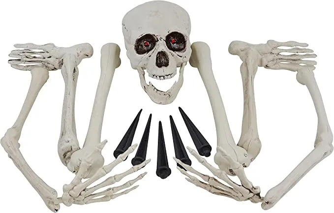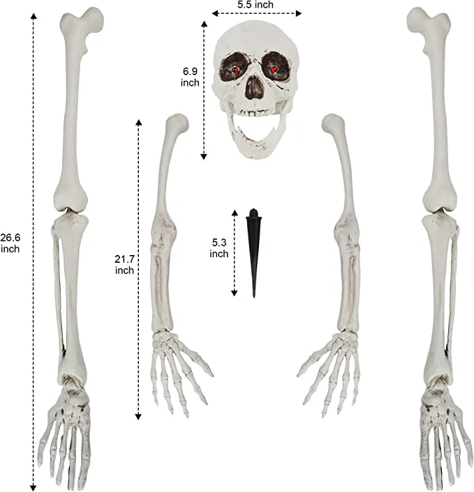 • Life Size Skeleton with Light up Eyes includes 1 pack of skeleton ground stakes, realistic skull, skeleton arms, and legs.