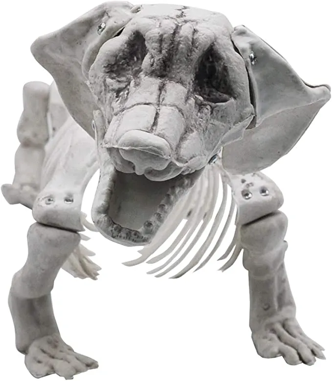 Make your Halloween decorating pop with this 23” tall skeleton dog decoration. The skeletal dog features a moveable head and jaw, and realistic-looking bones, and is great for indoor or outdoor use. Its durable plastic can be used indoors or out during the Halloween season, plus it makes an excellent table centerpiece at parties and events. The body features real rib cage ribs and spine details with realistic bones. It will give your Halloween decor that extra touch if you are hosting a party during the month of October.
