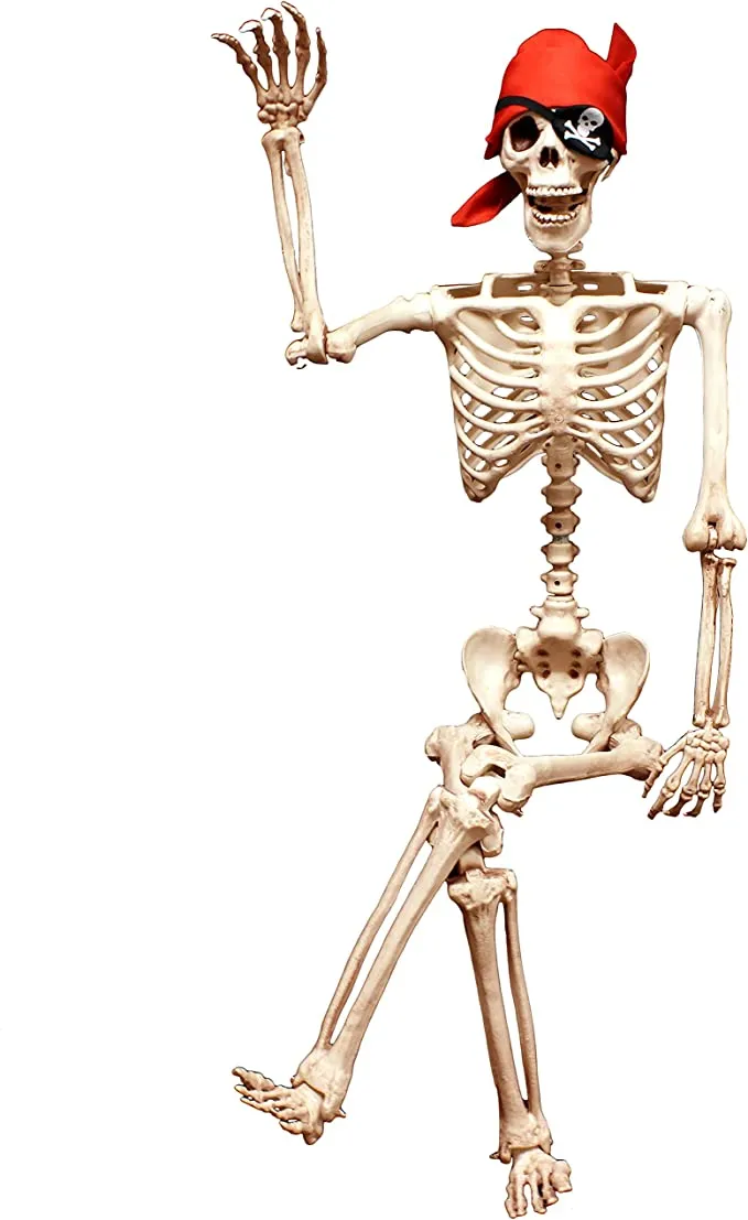 • Life Size Posable Skeleton Decoration includes 60″ Tall Posable Limbs with Knees Life Size Skeleton with Pirate Bandanna and Eyepatch.