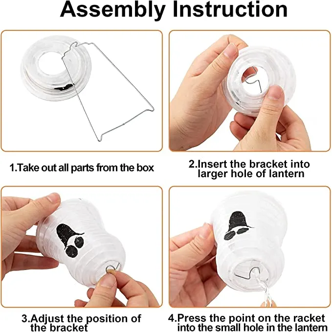 - SUPER VALUE PACK: 12 Halloween orange pumpkin and ghost folding lanterns printed with “Smiley” in different designs, 12 holders, 12 mini LED lights and 9.84 feet string. Requires assembly for the flashlights, but is easy to install and use.