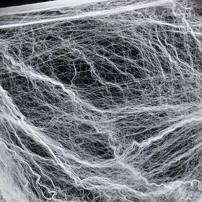 • The large spider web measures approximately 23×18 ft/ 7×5.5 m. The spider measures about 5 ft. The bag of the stretch cobweb is about 120g stretching up to 330 sq. ft.