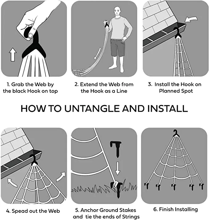 • A hook (for the gutter) and 5 stakes (for the ground) are what you need to set up a spider web in your yard. It would be an easy process to install this Halloween decor