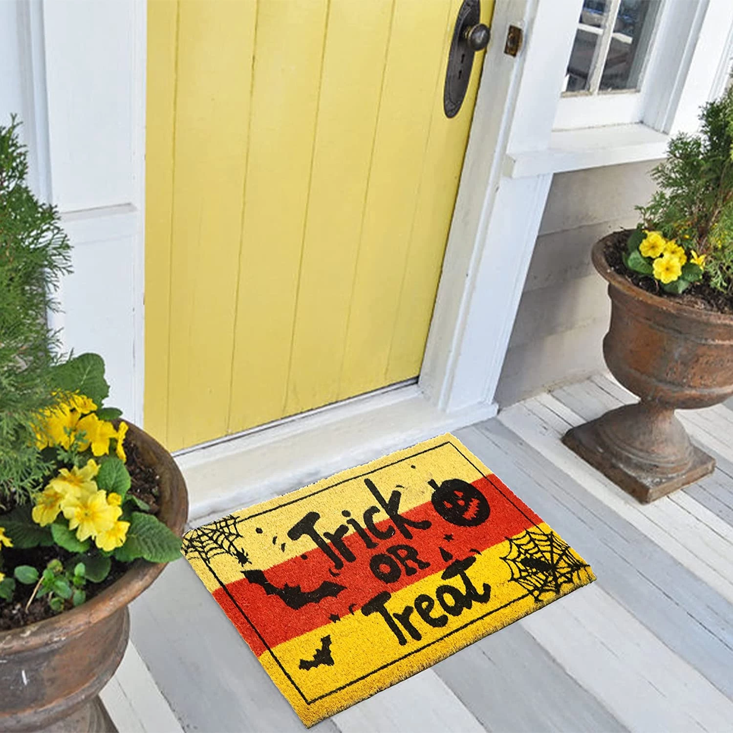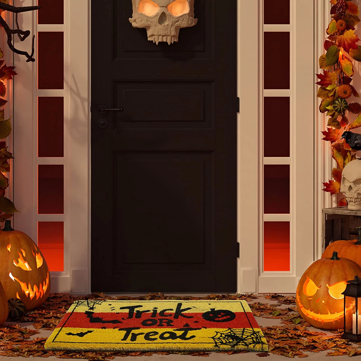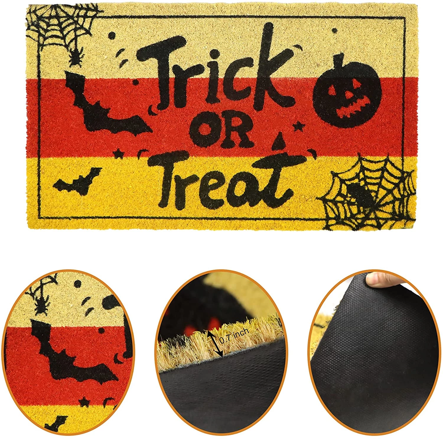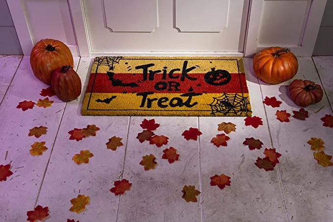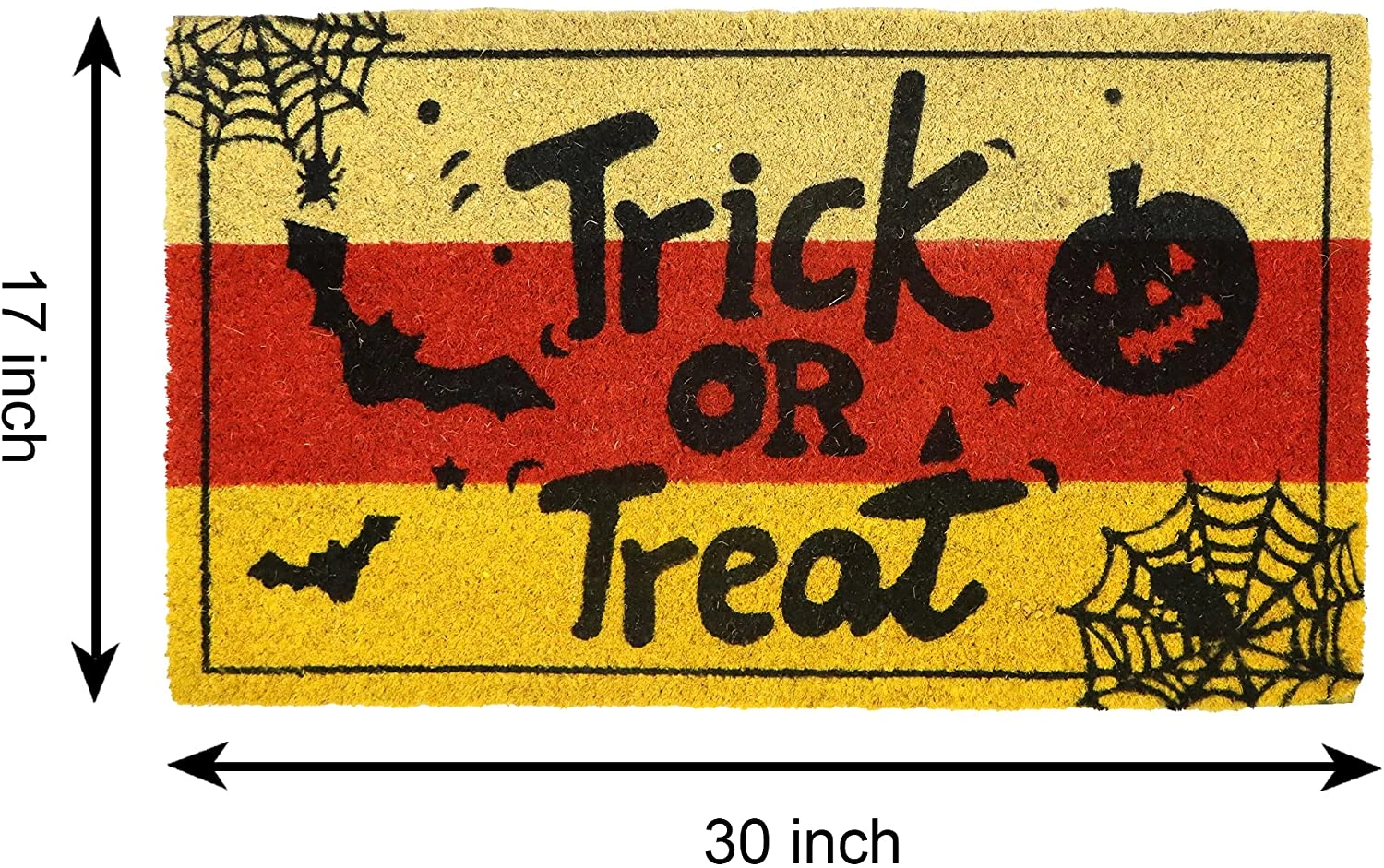 - Our Trick-or-Treat doormat with bat design measures 30″x17″.