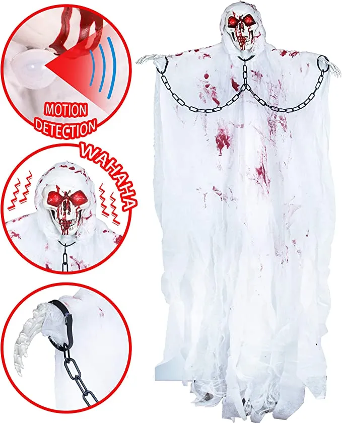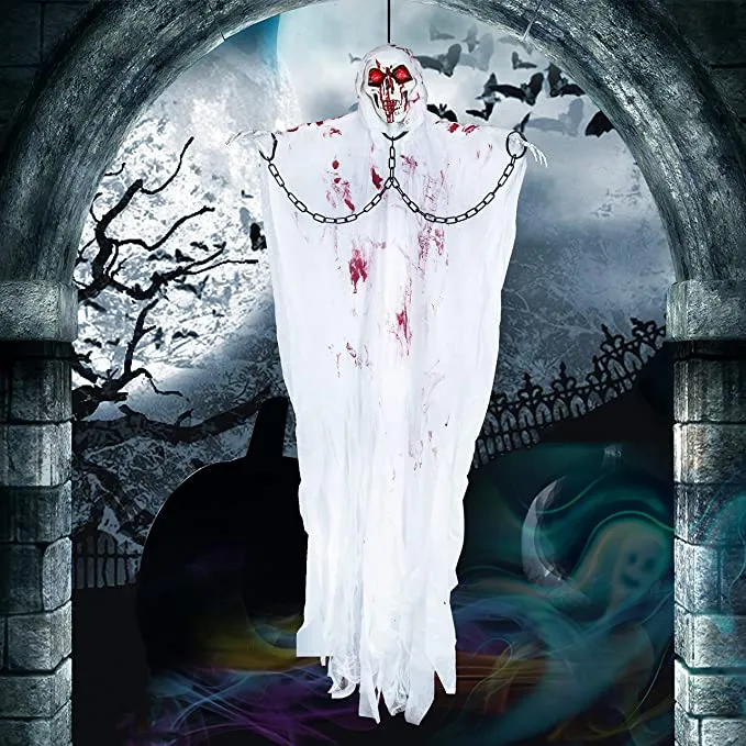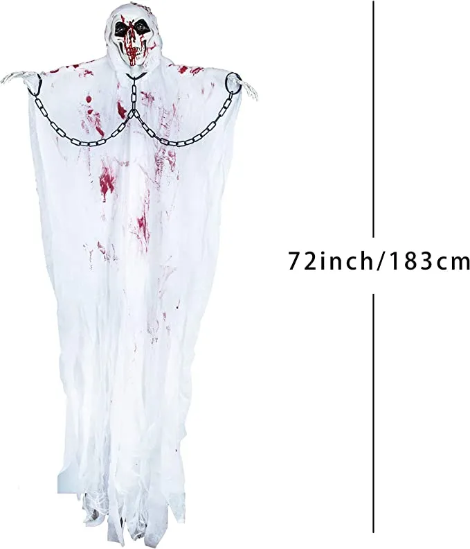 - JOYFY Halloween Hanging Grim Reaper is designed with chains, and cloth with details of splattered blood to create the creepy look