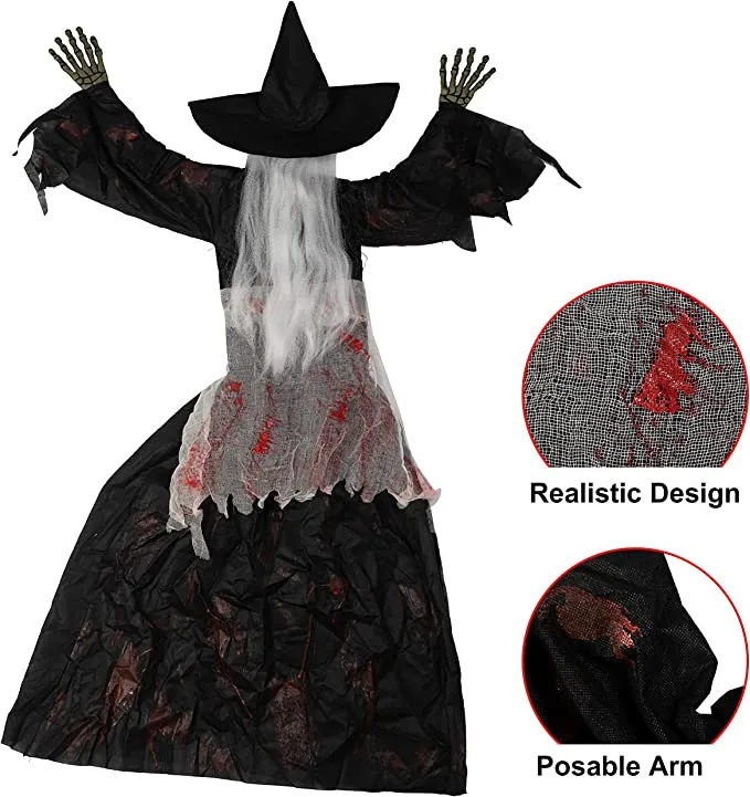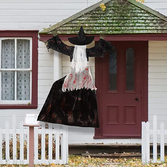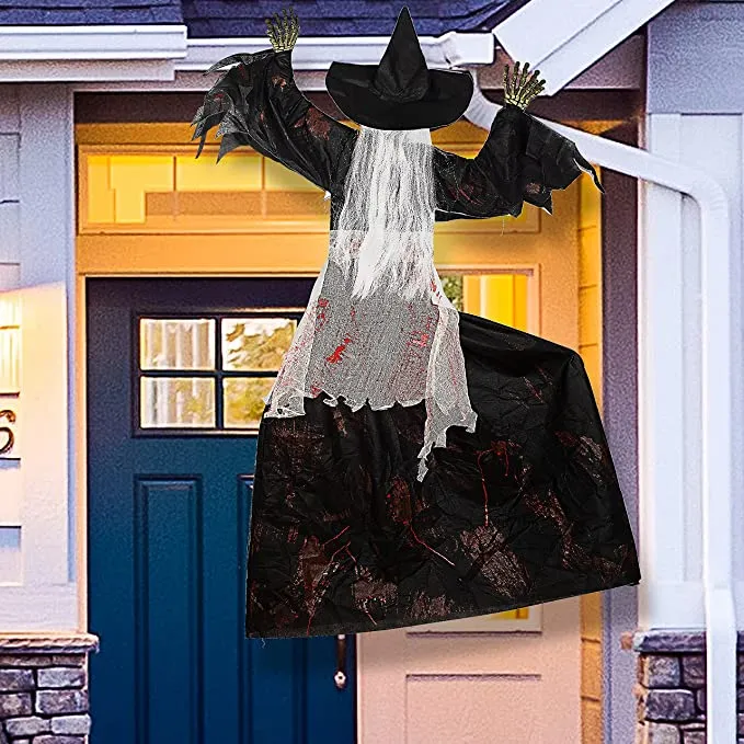 - Our witch wall climber decor is creatively designed to provide more realistic features like clothes with blood on it and a white hair. It measures 38.6 inches with posable arms.
