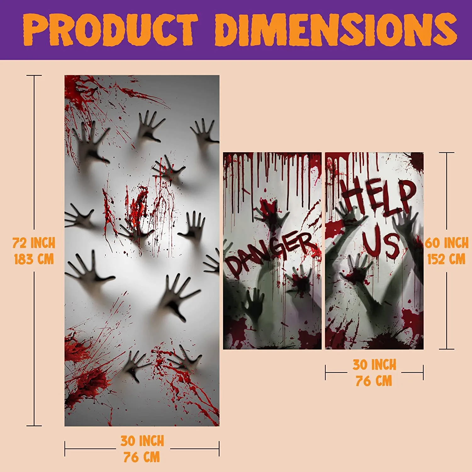 - AWESOME HALLOWEEN DECOR. Our Halloween Party Decoration Set include 1 pcs Zombie Hand Door Cover+2 Widow Covers+1 pcs Weapon Garland+4 pcs Window Stickers Which measuring 11*14inches