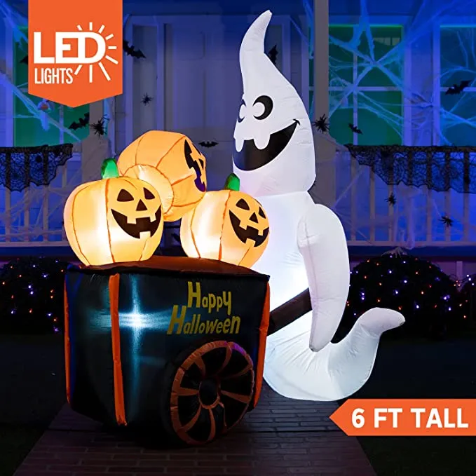 Joiedomi 6ft Inflatable LED Ghost Pushing Pumpkin Cart – Halloween Decorations